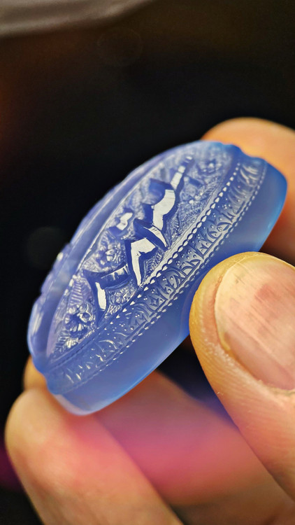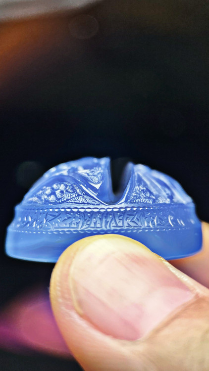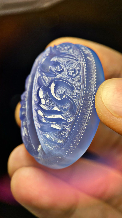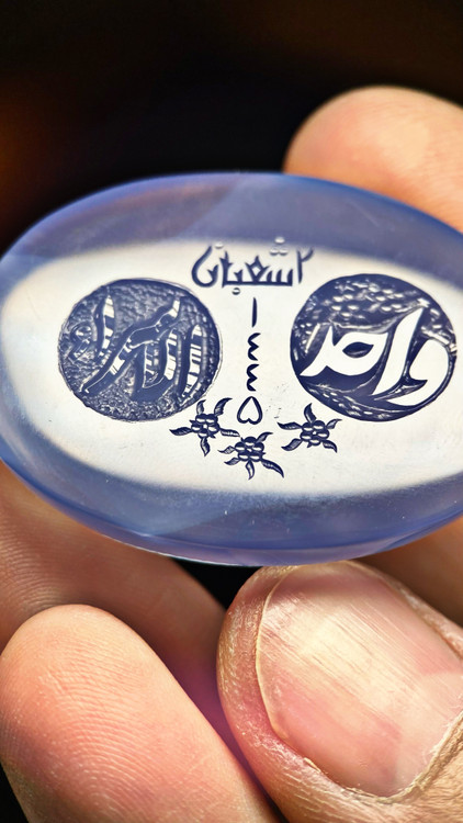شاهکار بی تکرار از مجموعه بی رقیب سادات اهواز اثر موزه ای و فوق کلکسیونی با دو امضاء ارزشمند «واحد» و «الاسراء» حکاکی شده به دستان هنرمند اساتید «سید ابوالفضل موسوی جلال» و «سعید عزیزپور» منقش به نام پر جلال و جبروت امیرالمومنین. متن روی سنگ: علی رایة الهدی ، اسد الله. متن دور سنگ : نادعلی.