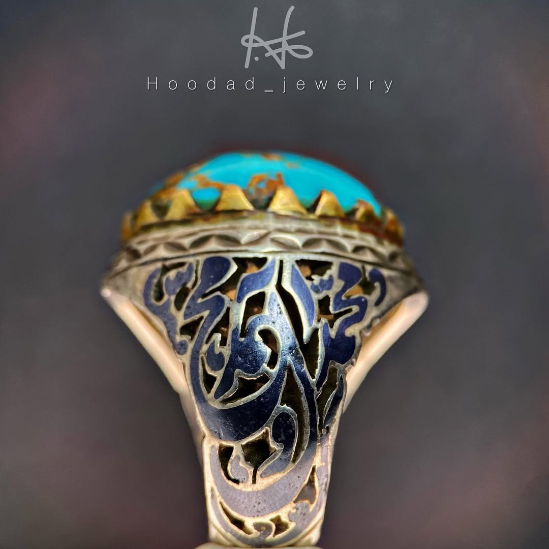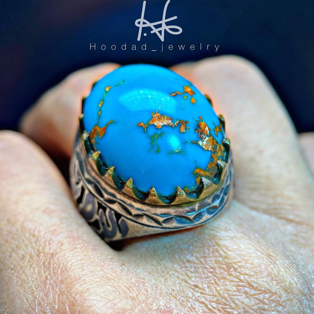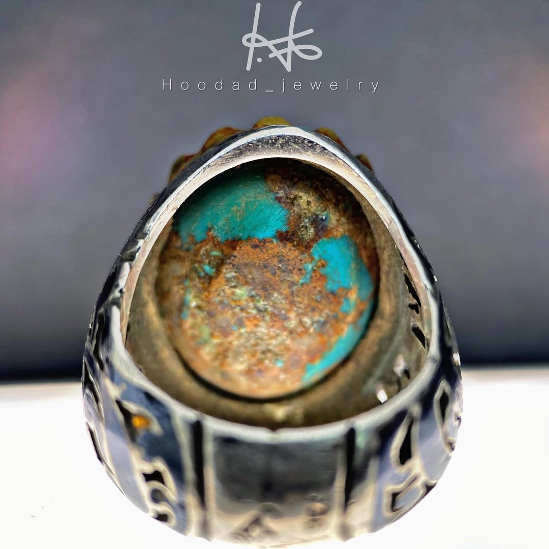 انگشتر فیروزه نیشابوری دامله سایز ۲۰ با رکاب نقره ۹۲۵ مدل فیلی ارّه کاری شده