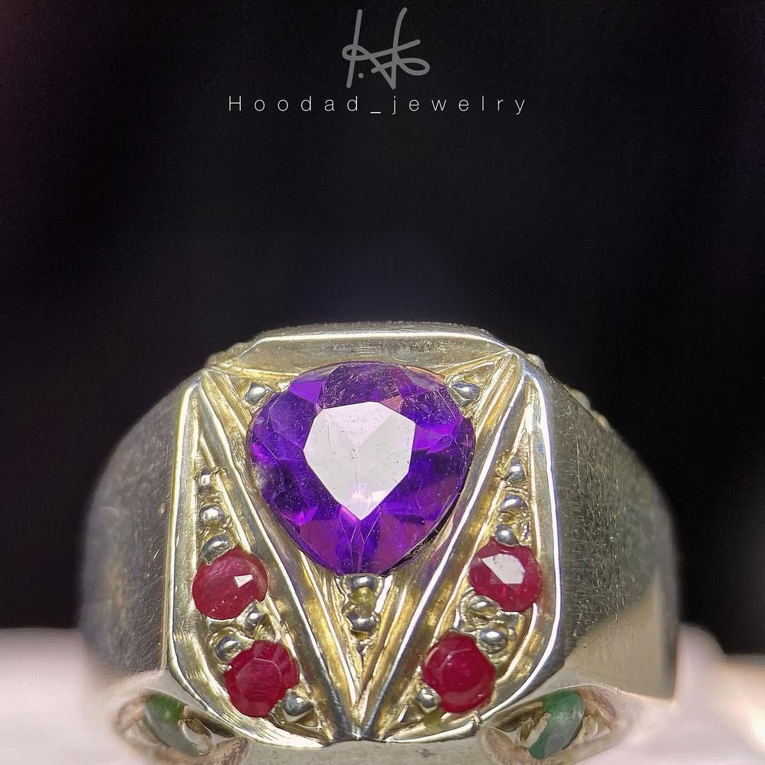 انگشتر آمیتیست طبیعی با مخراج زمرد زامبیا و یاقوت سرخ